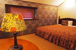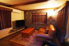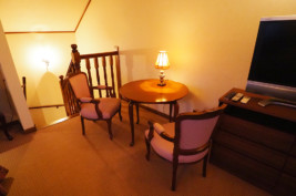 1階にリビング、2階に寝室を備えたメゾネットタイプ。2階のベッドルームには木彫が施されたセミダブルベッドを2台くっつけた、ハリウッドツインタイプが置かれています。恋人同士はもちろん、お友達同士のご利用にも人気です。運が良ければ気まぐれで遊びに来る、野生のリスに出会えるかも。